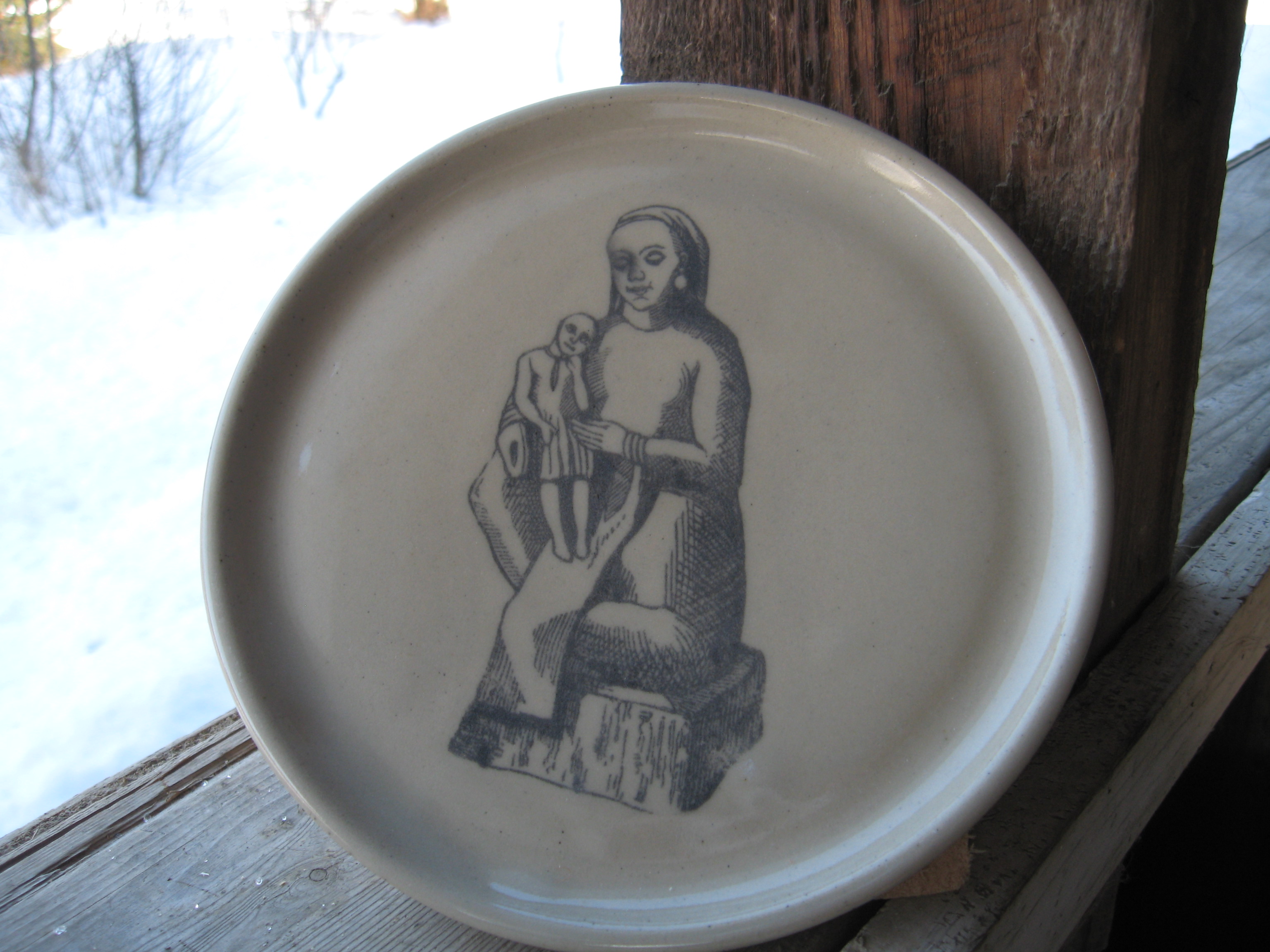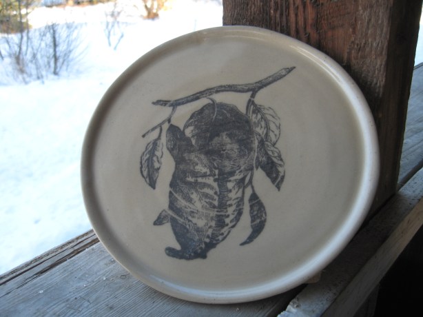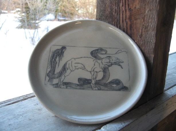 This small precious plate displays a tortoise skeleton floating on its surface (but not really because the image is stained into the clay itself). It measures roughly 5″ in diameter.