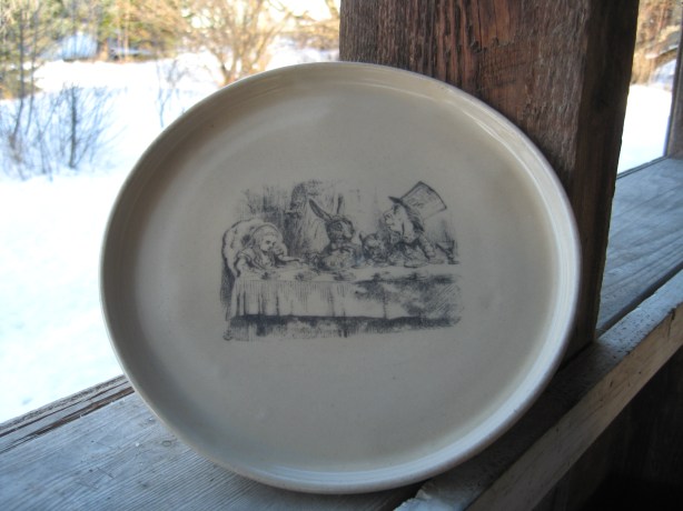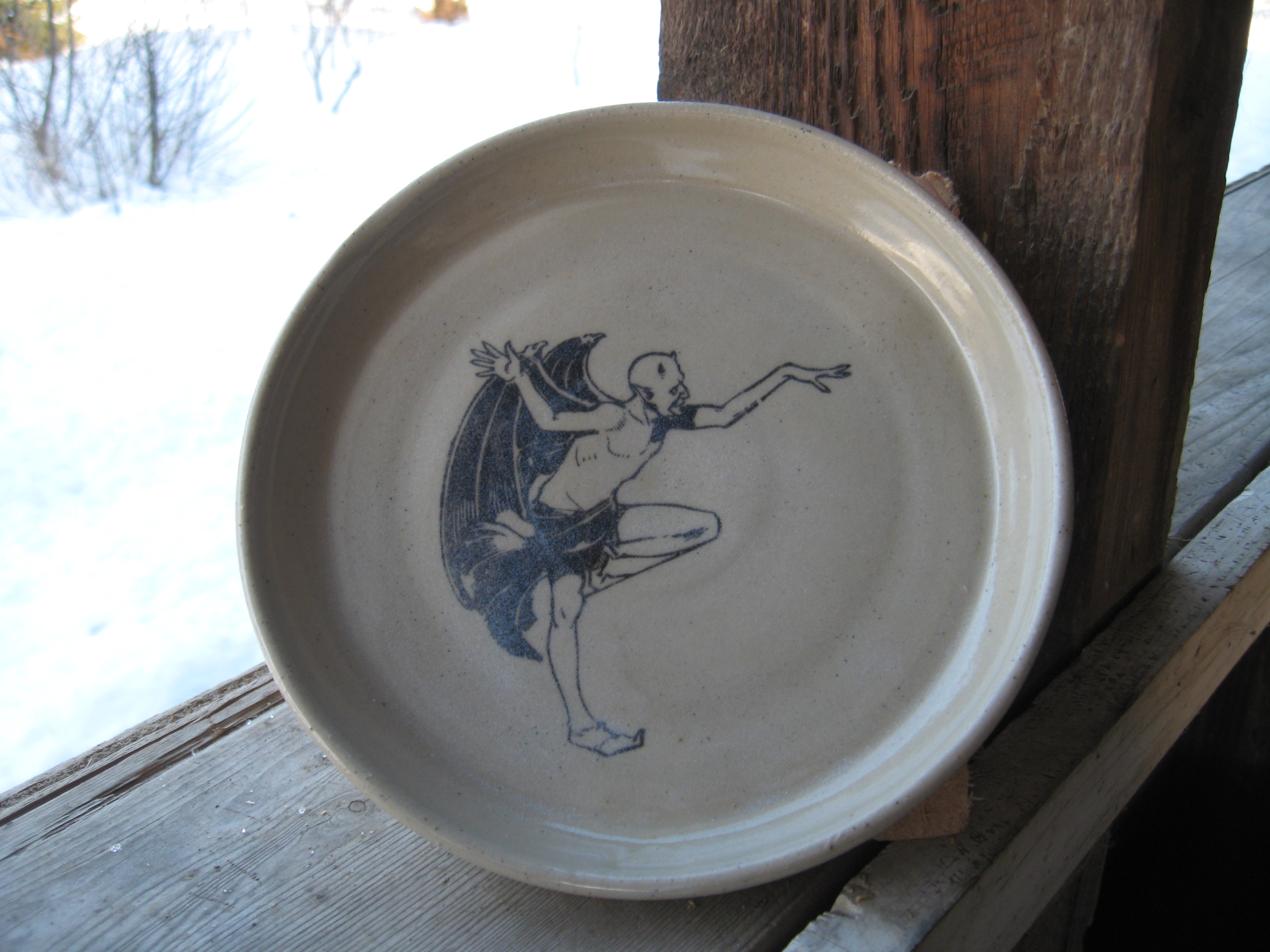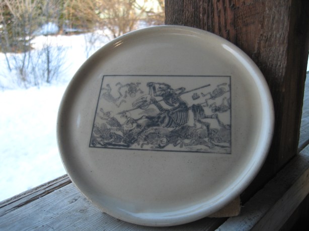 This large precious plate displays a frog skeleton ready to jump into your cupboard. It measures roughly 9″ in diameter.