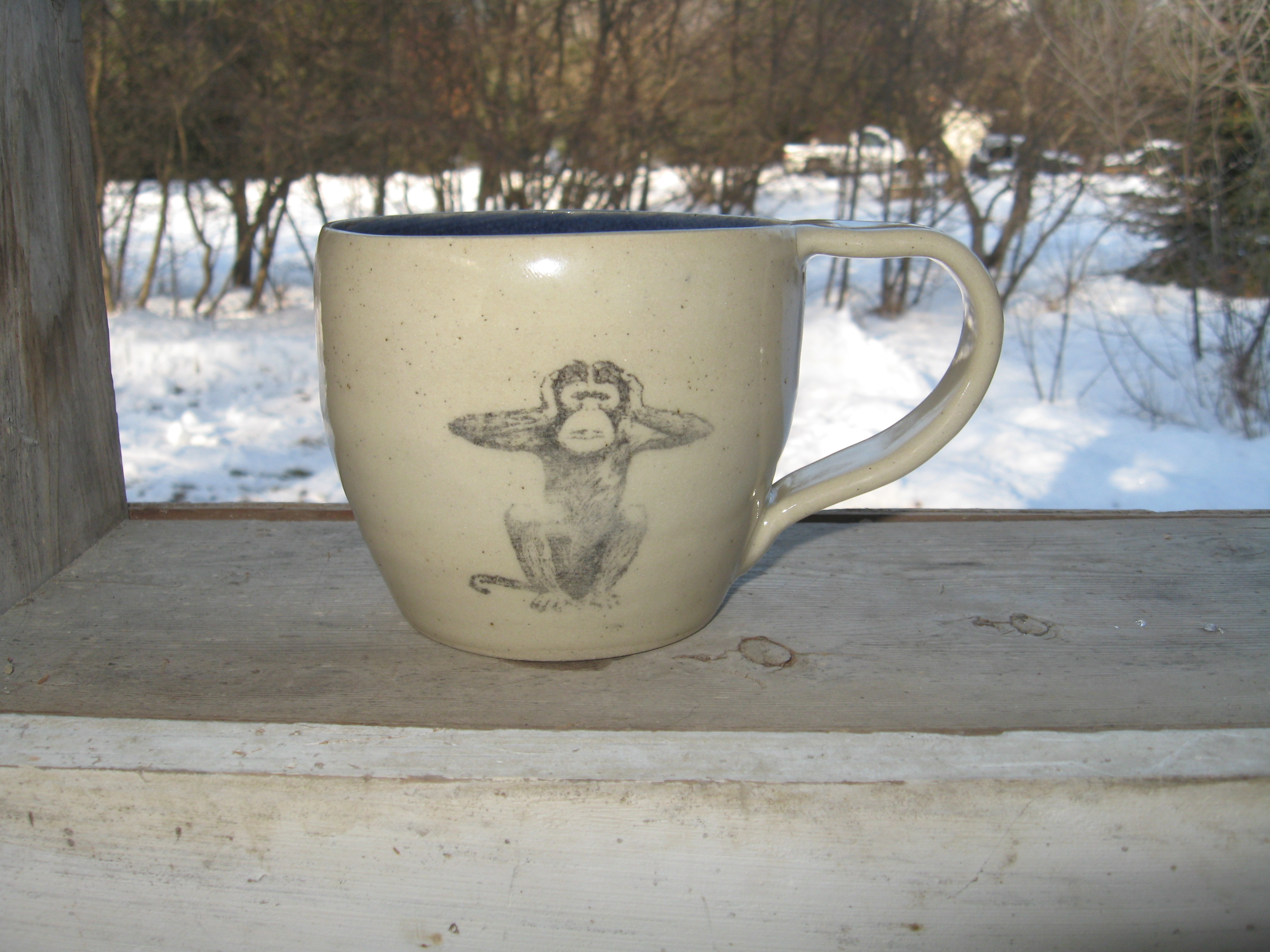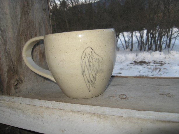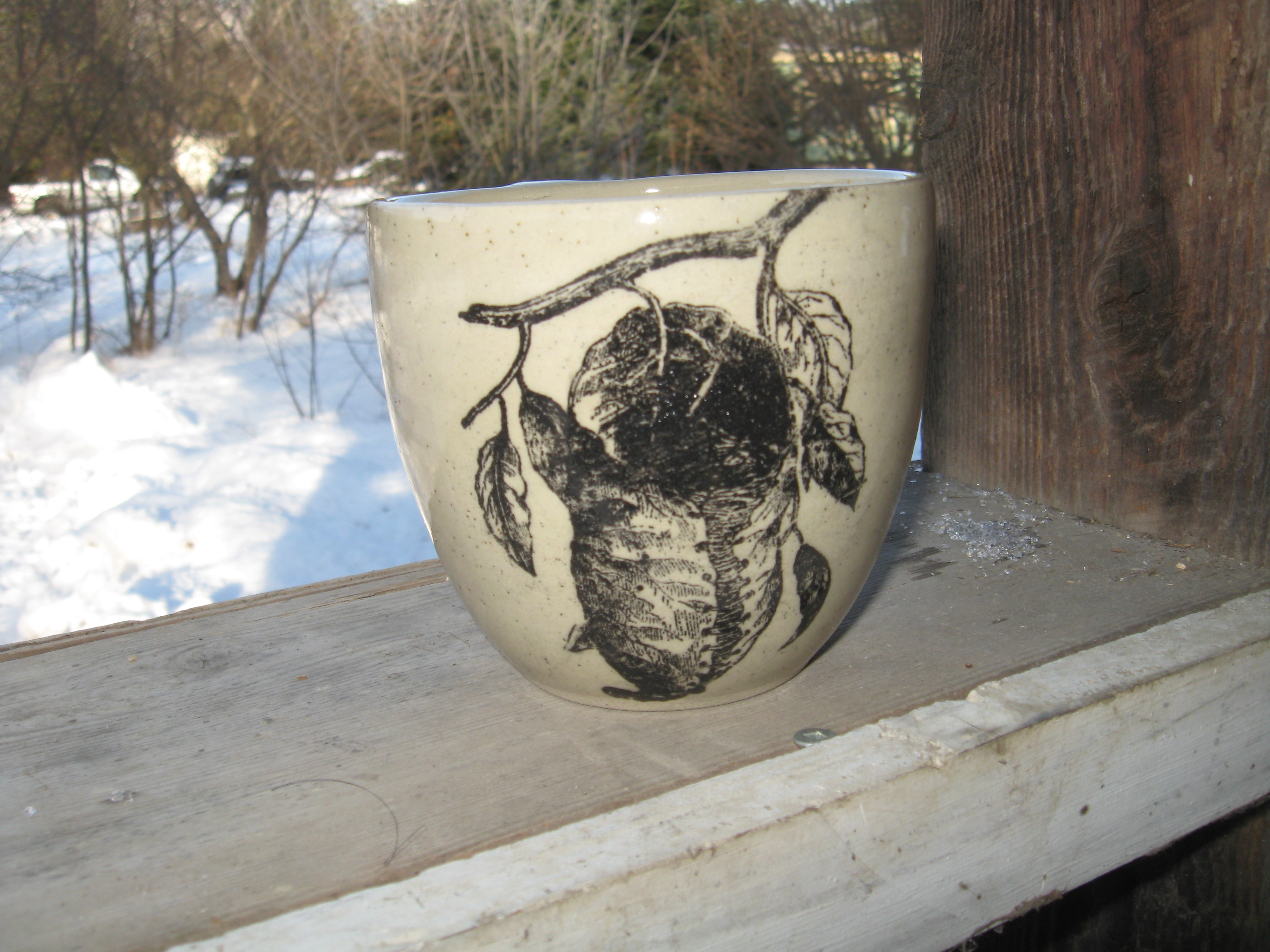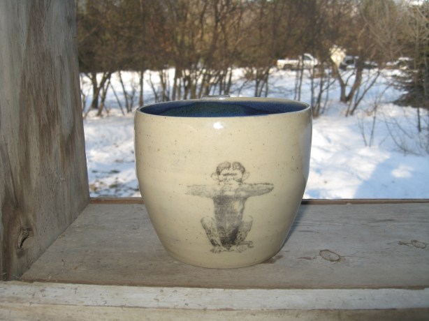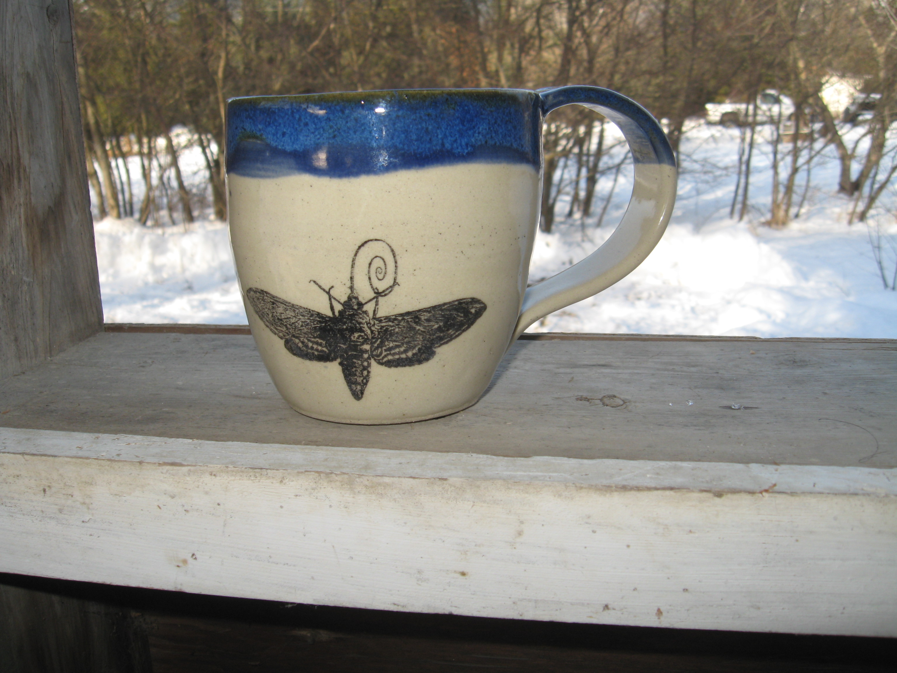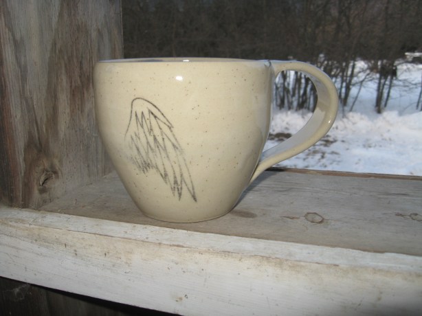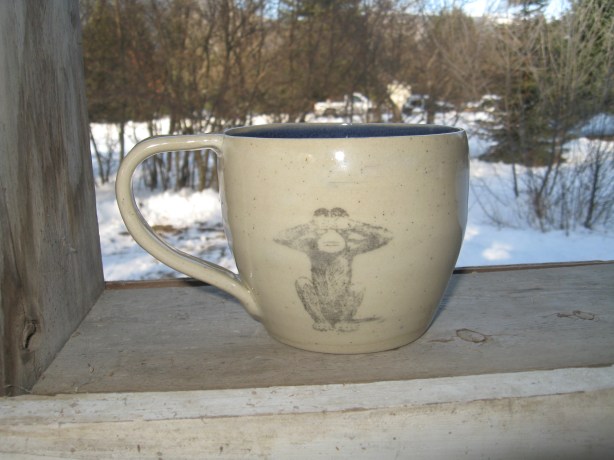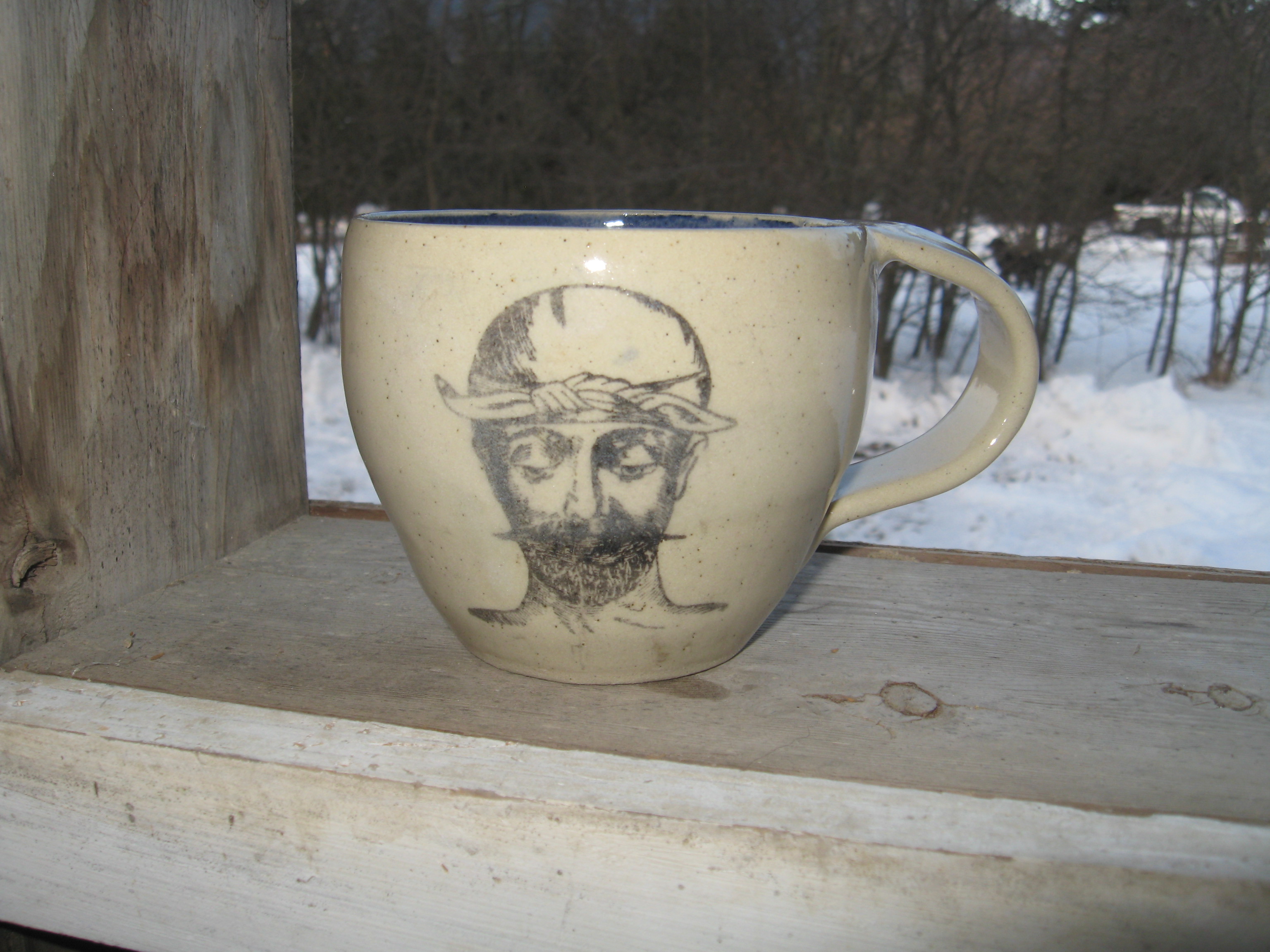 The next mug indicates my newer style of leaving the external portion of the mug more pure with only clear glaze over an image. This not only allows me more room for the image (hence, a larger image) but it also provides a greater contrast between the black of the image and the natural colour of the clay.