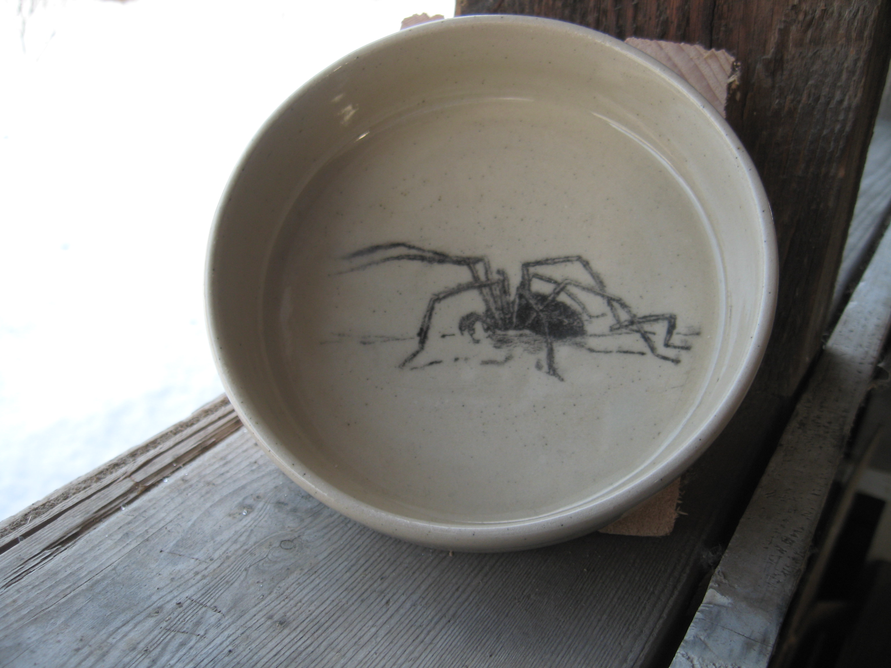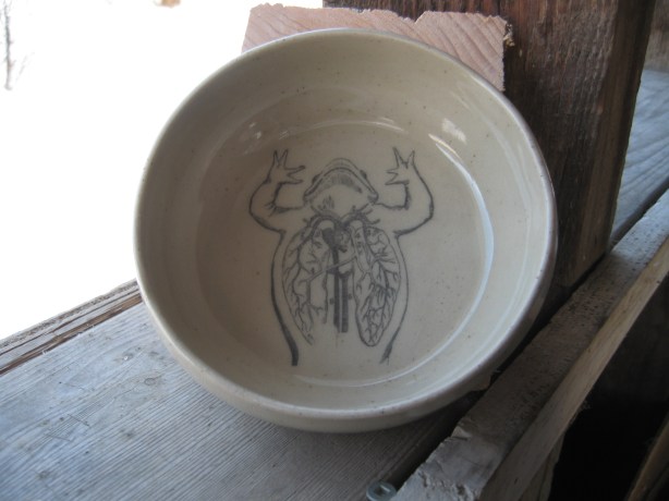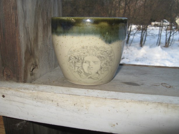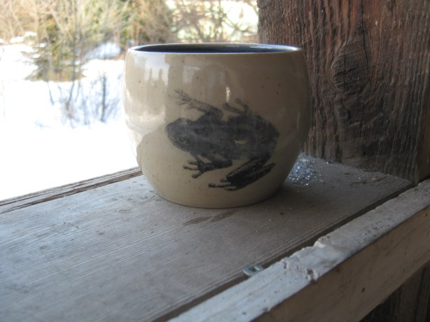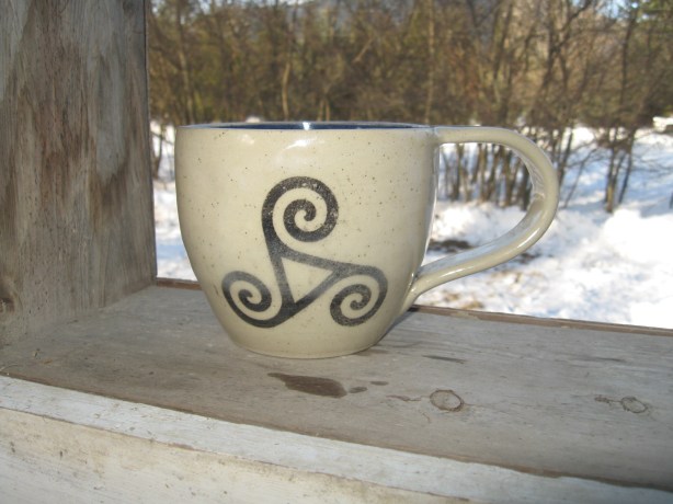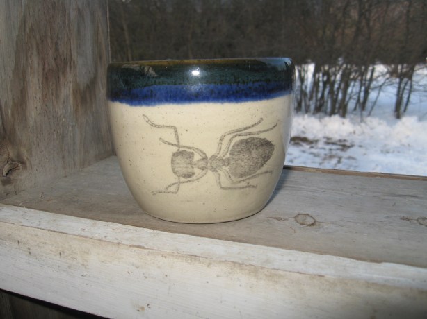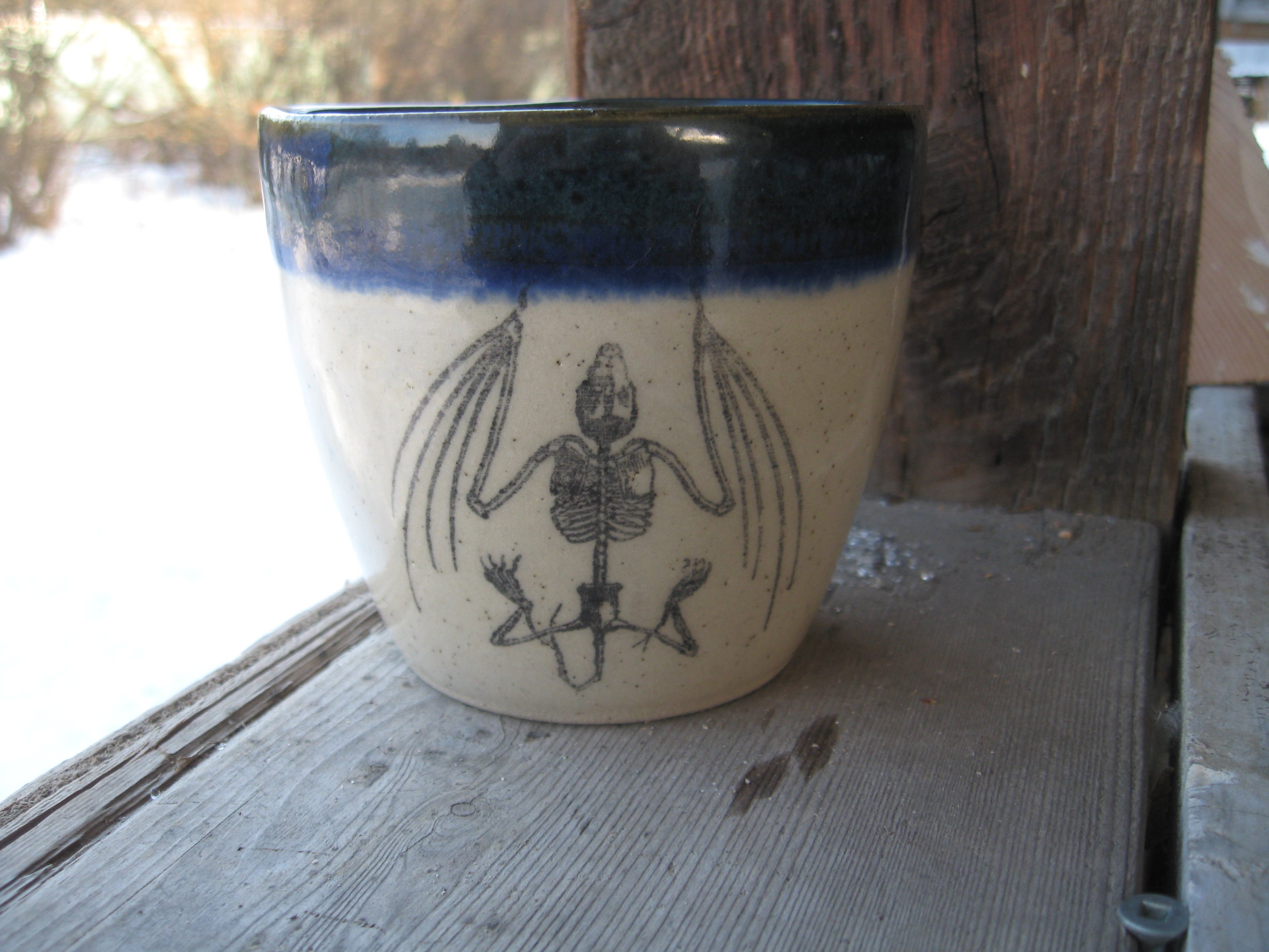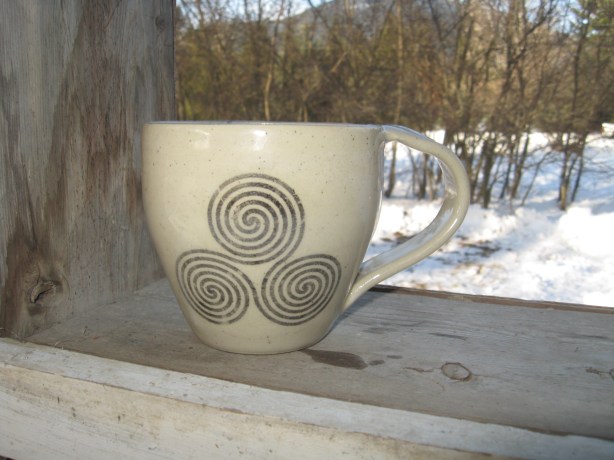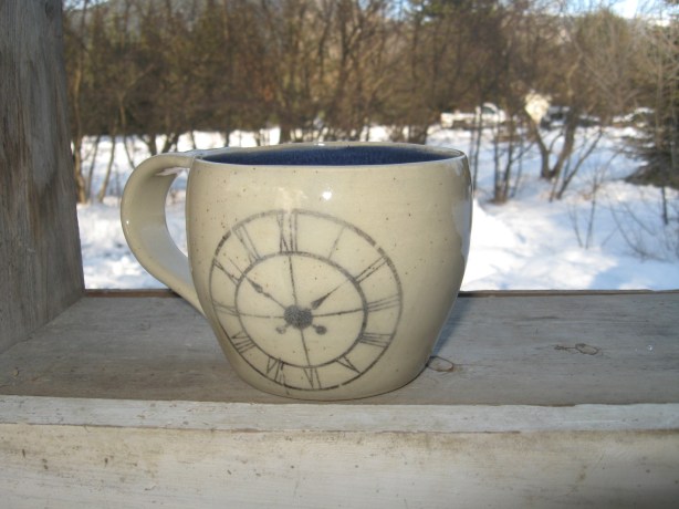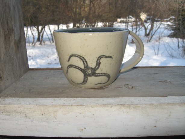 The next mug indicates my newer style of leaving the external portion of the mug more pure with only clear glaze over an image. This not only allows me more room for the image (hence, a larger image) but it also provides a greater contrast between the black of the image and the natural colour of the clay.
