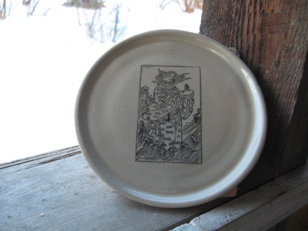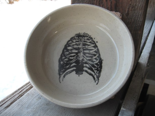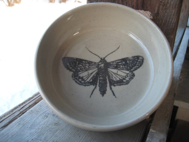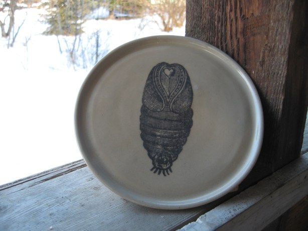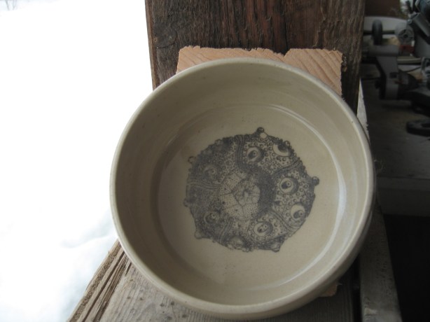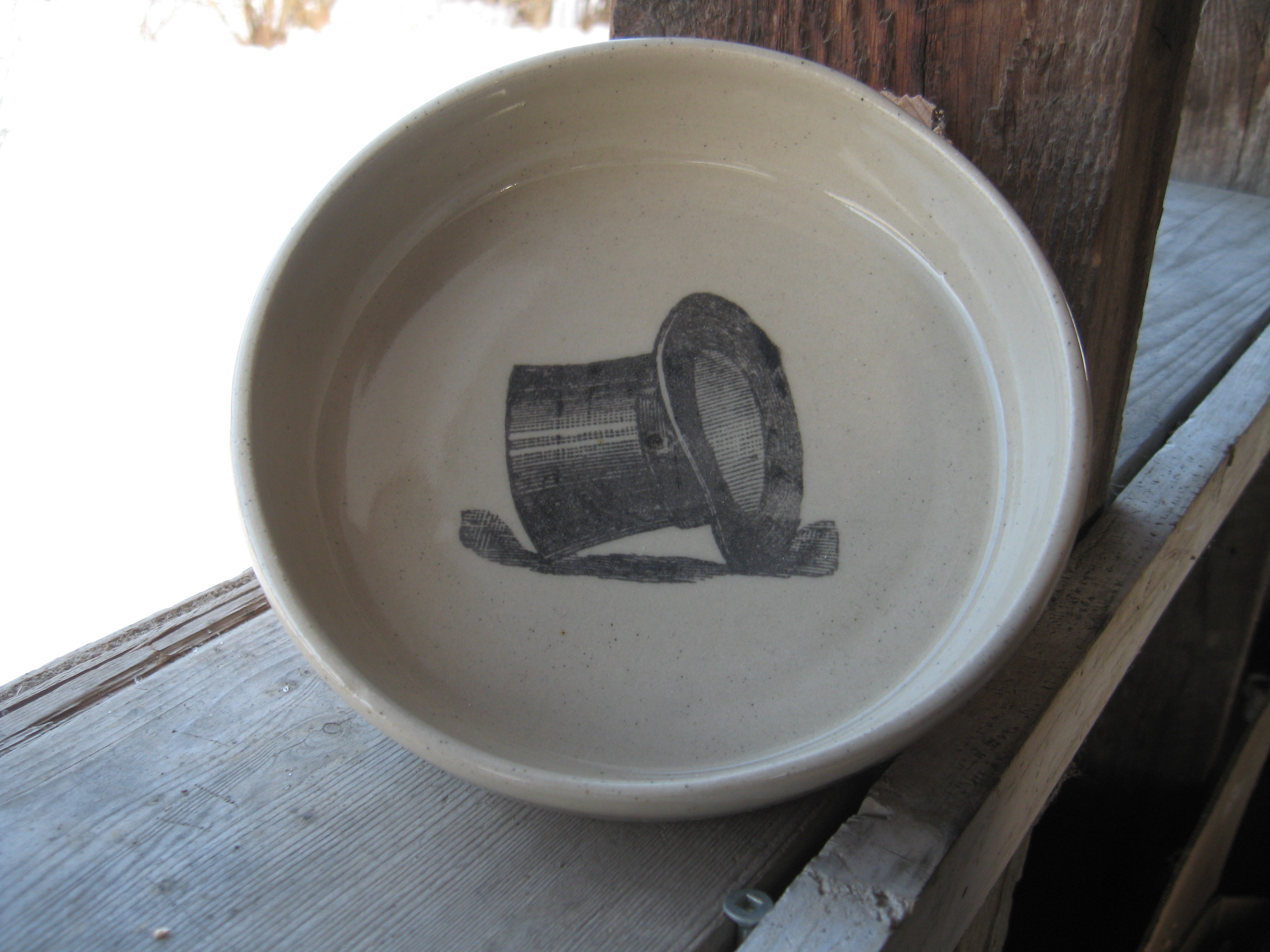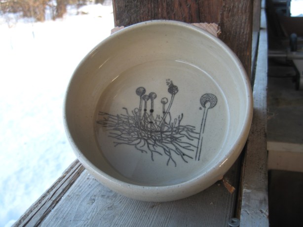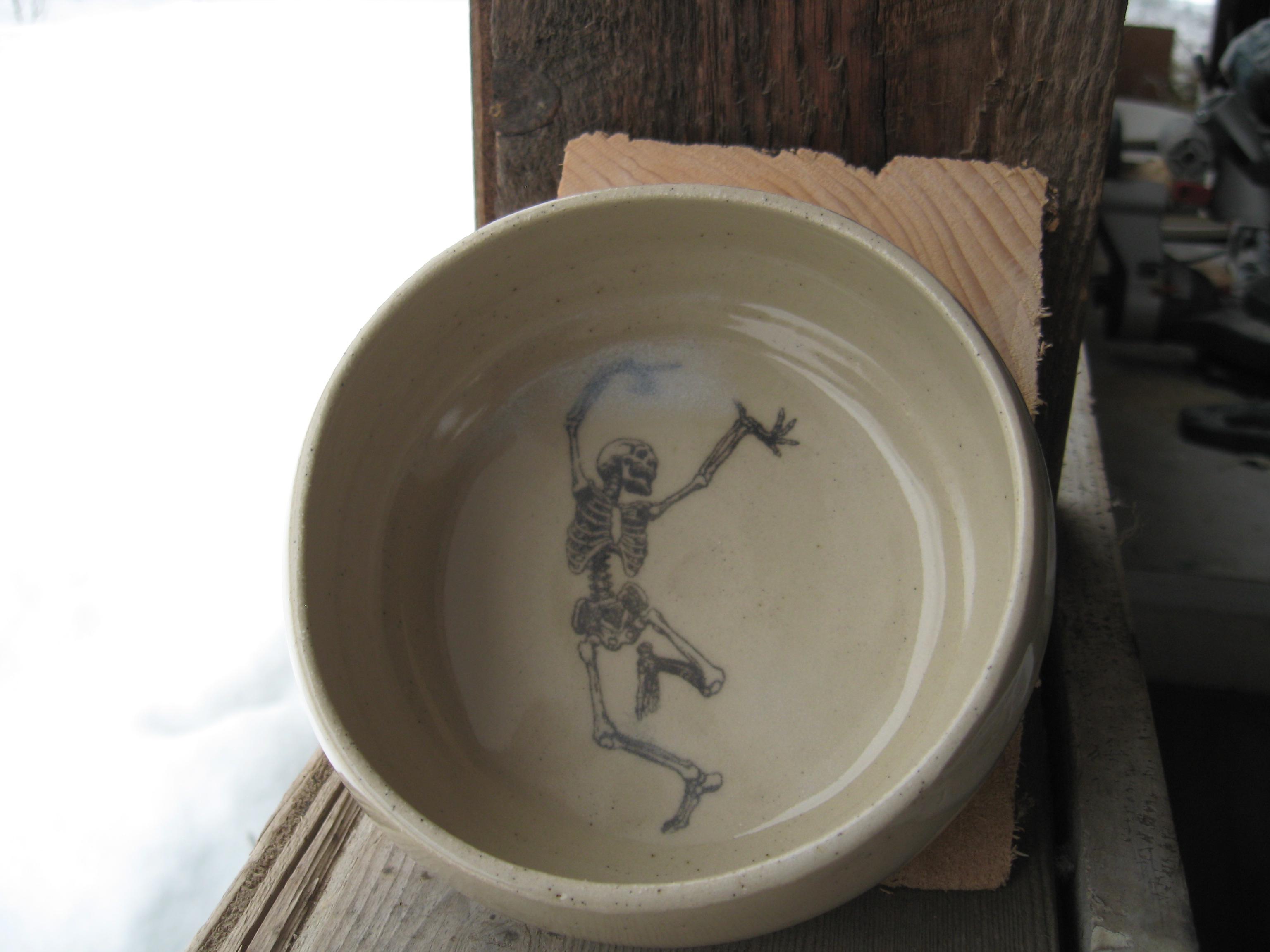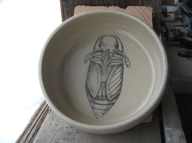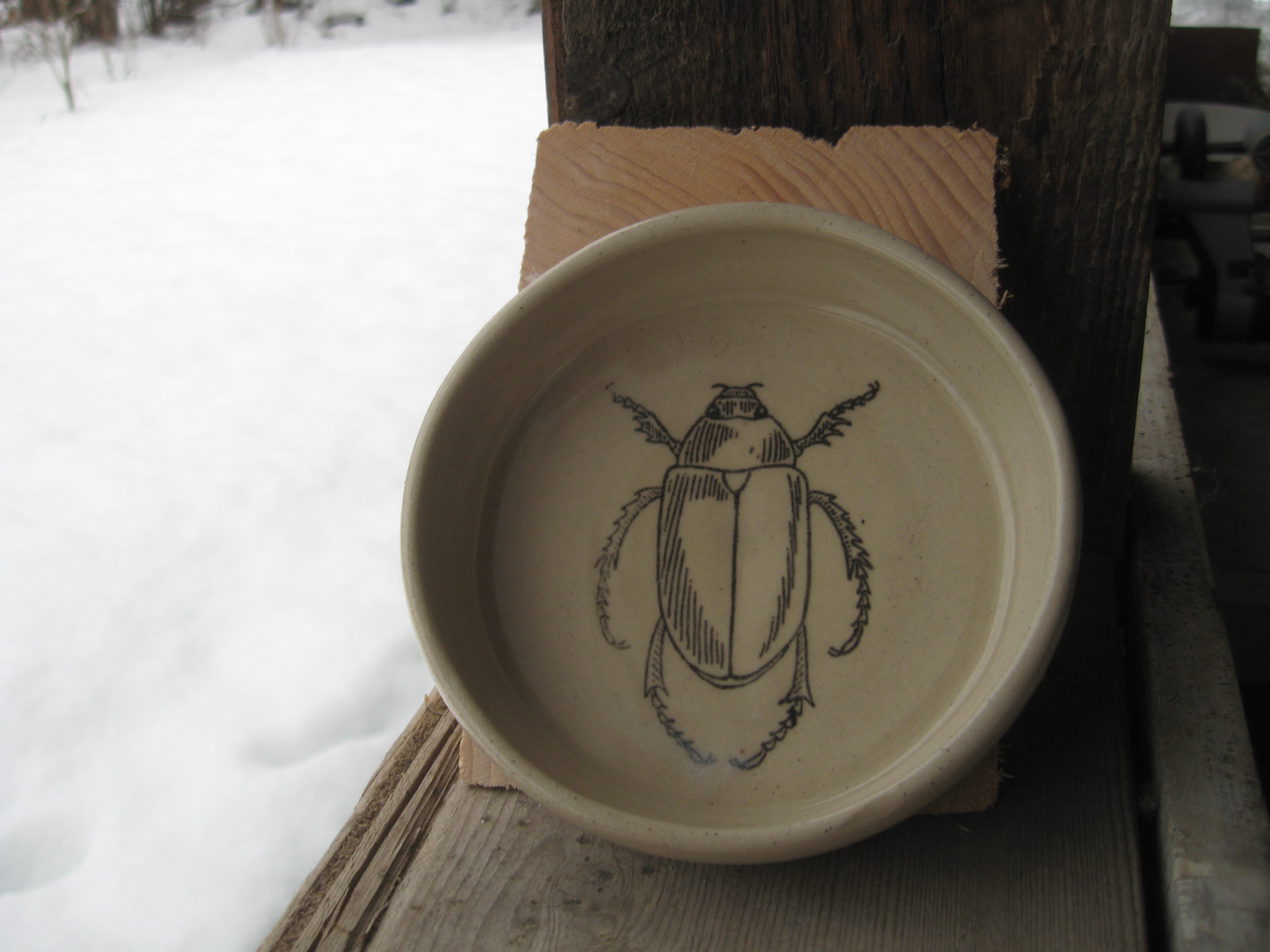 The next mug indicates my newer style of leaving the external portion of the mug more pure with only clear glaze over an image. This not only allows me more room for the image (hence, a larger image) but it also provides a greater contrast between the black of the image and the natural colour of the clay.