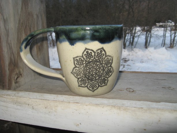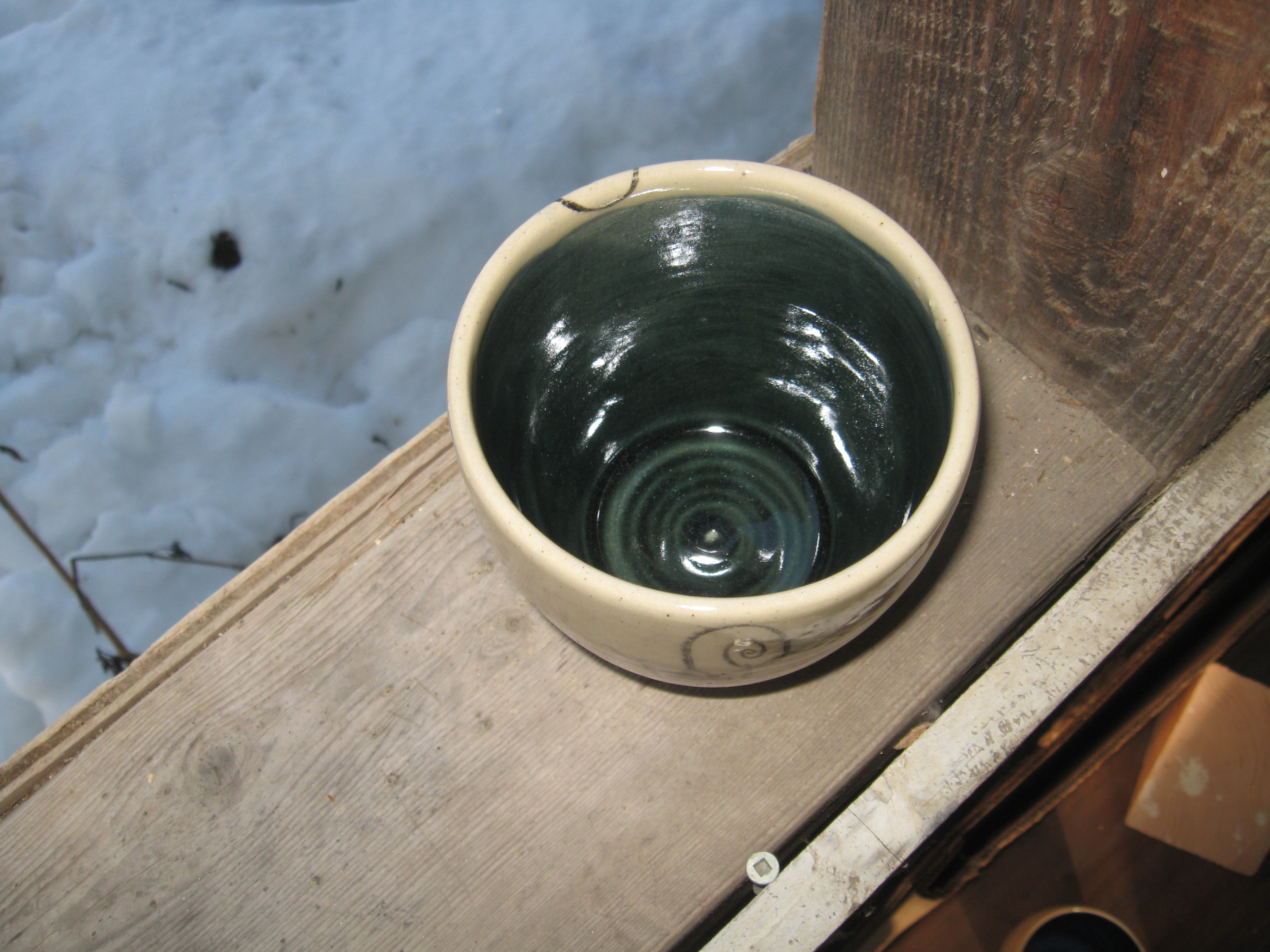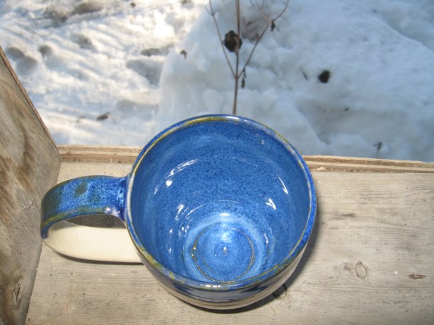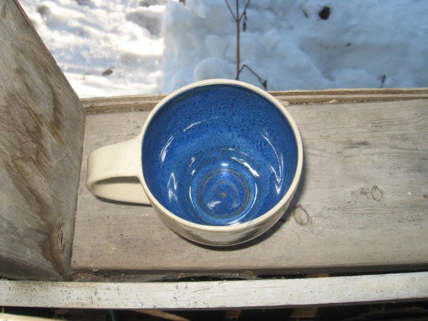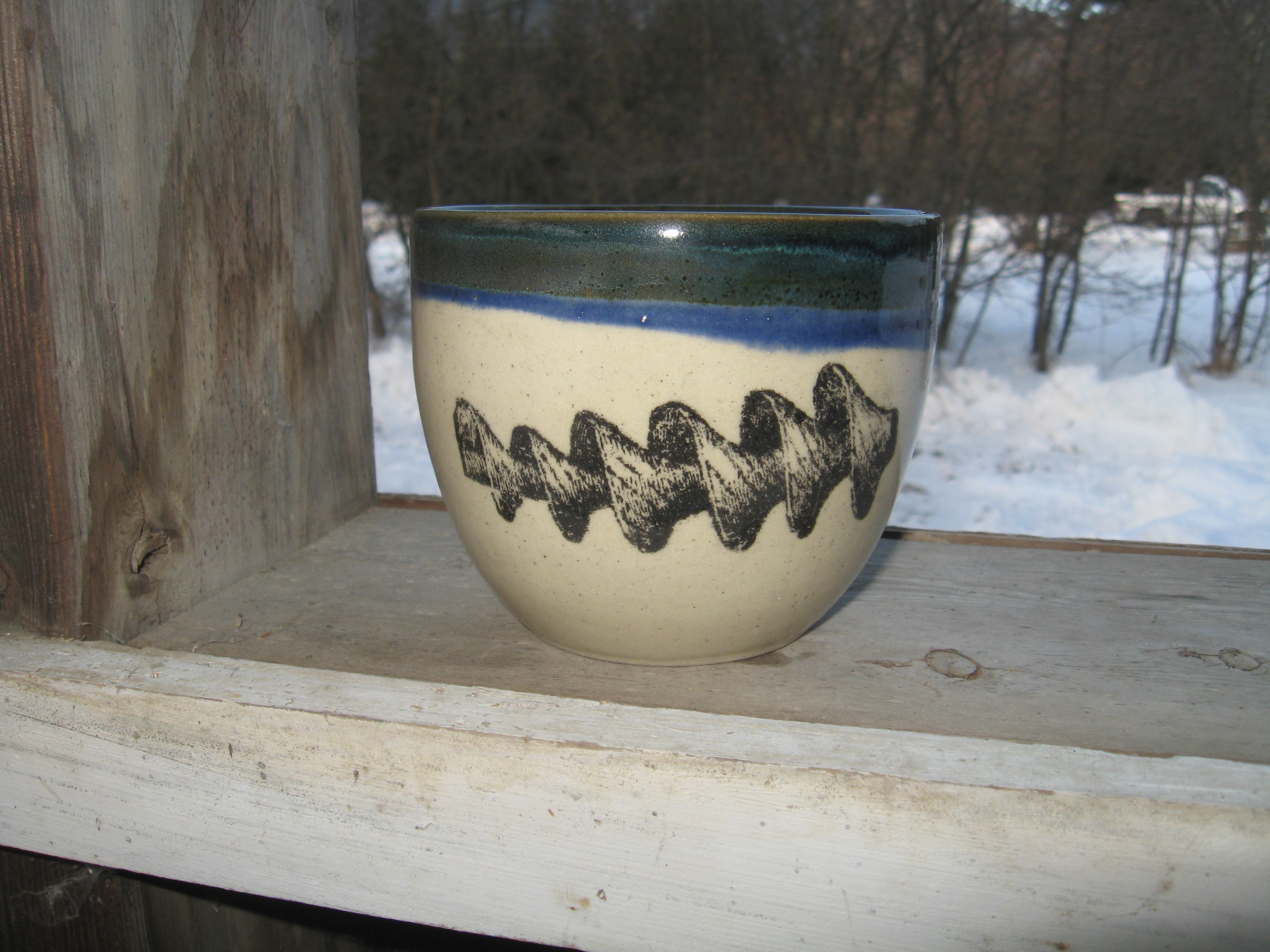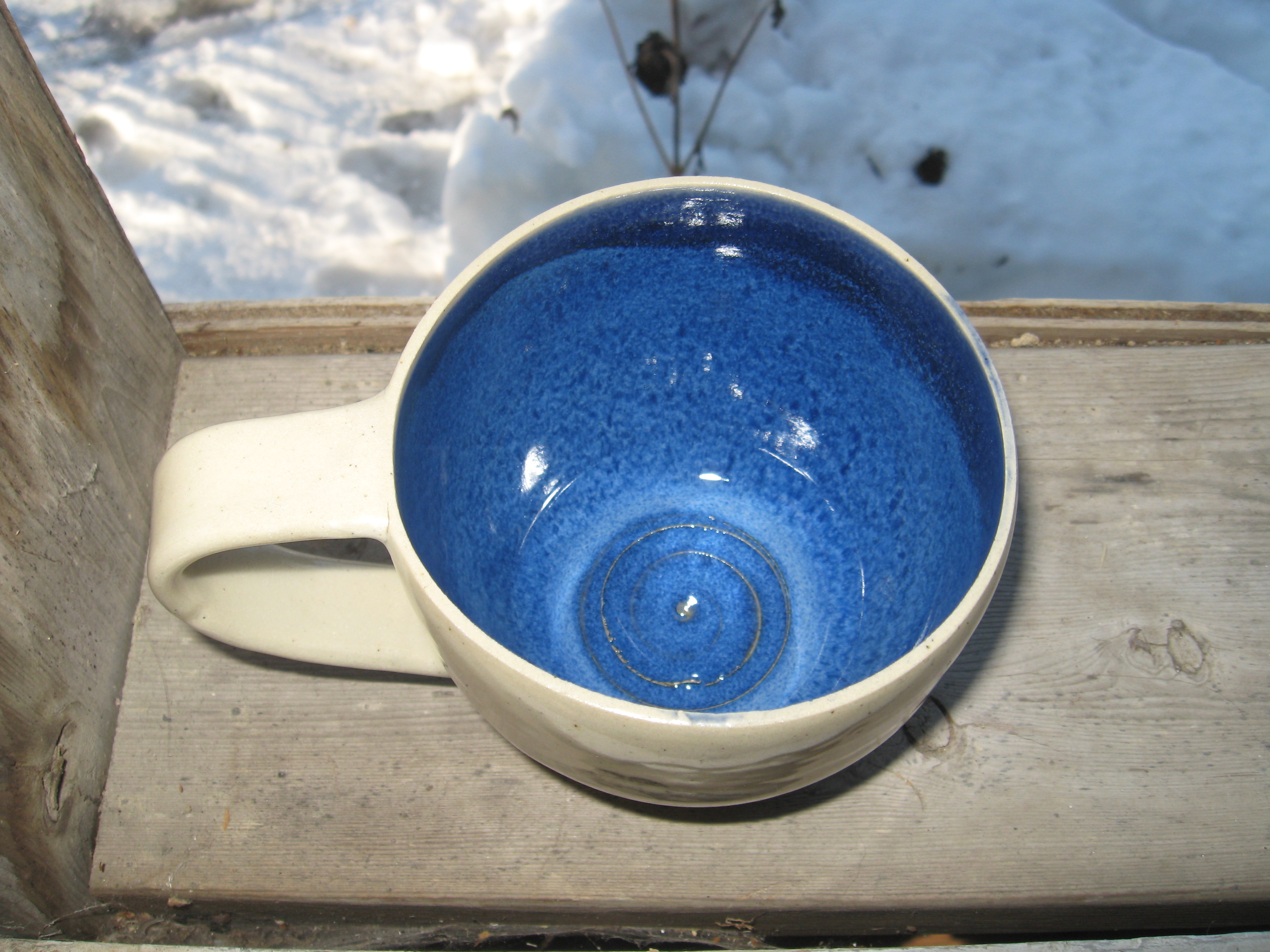 These marvelous mugs pulls the eye in a downward spiral. The first one is representative of my old style of dipping the rim of the mug in the coloured glaze.
