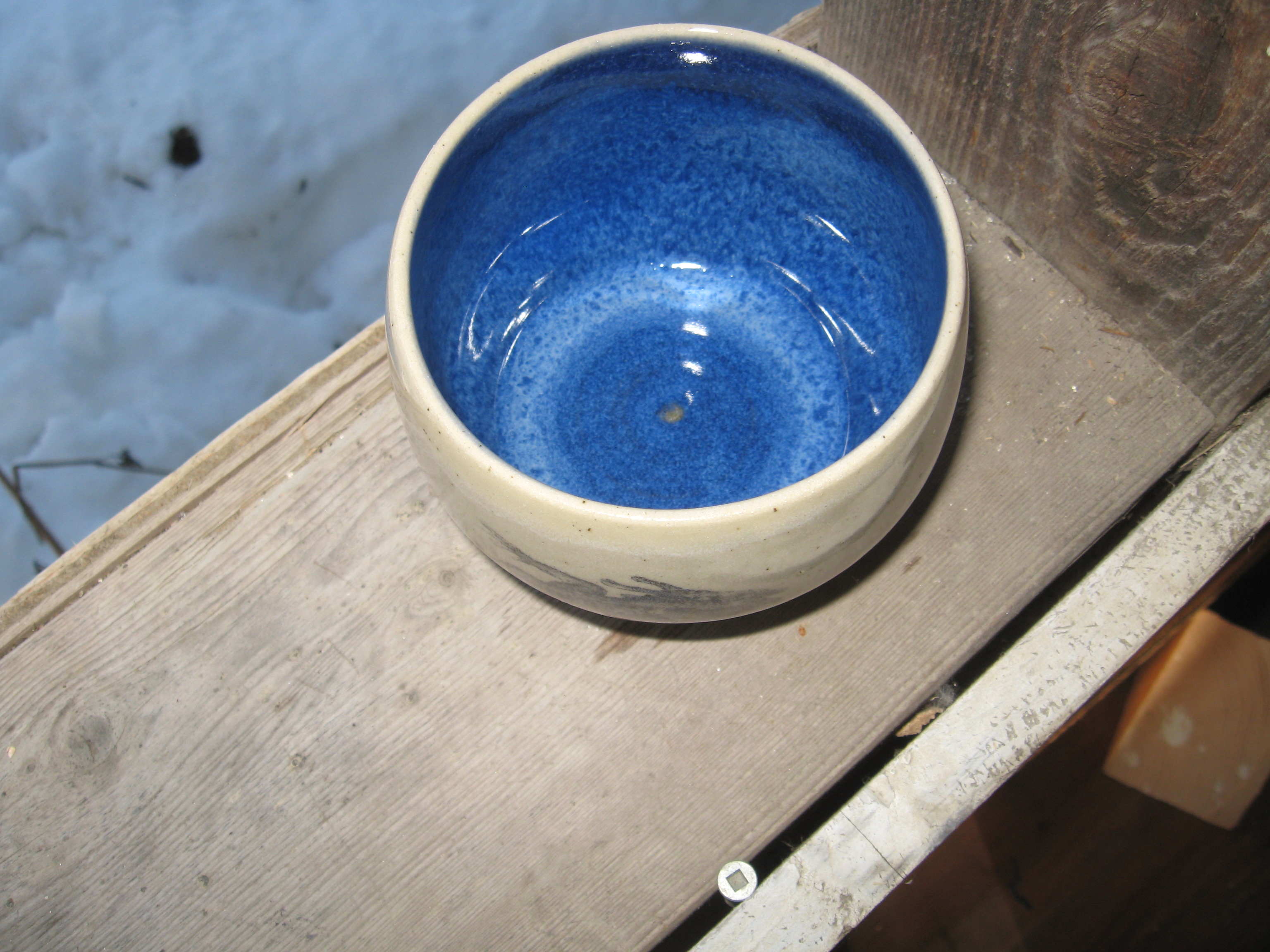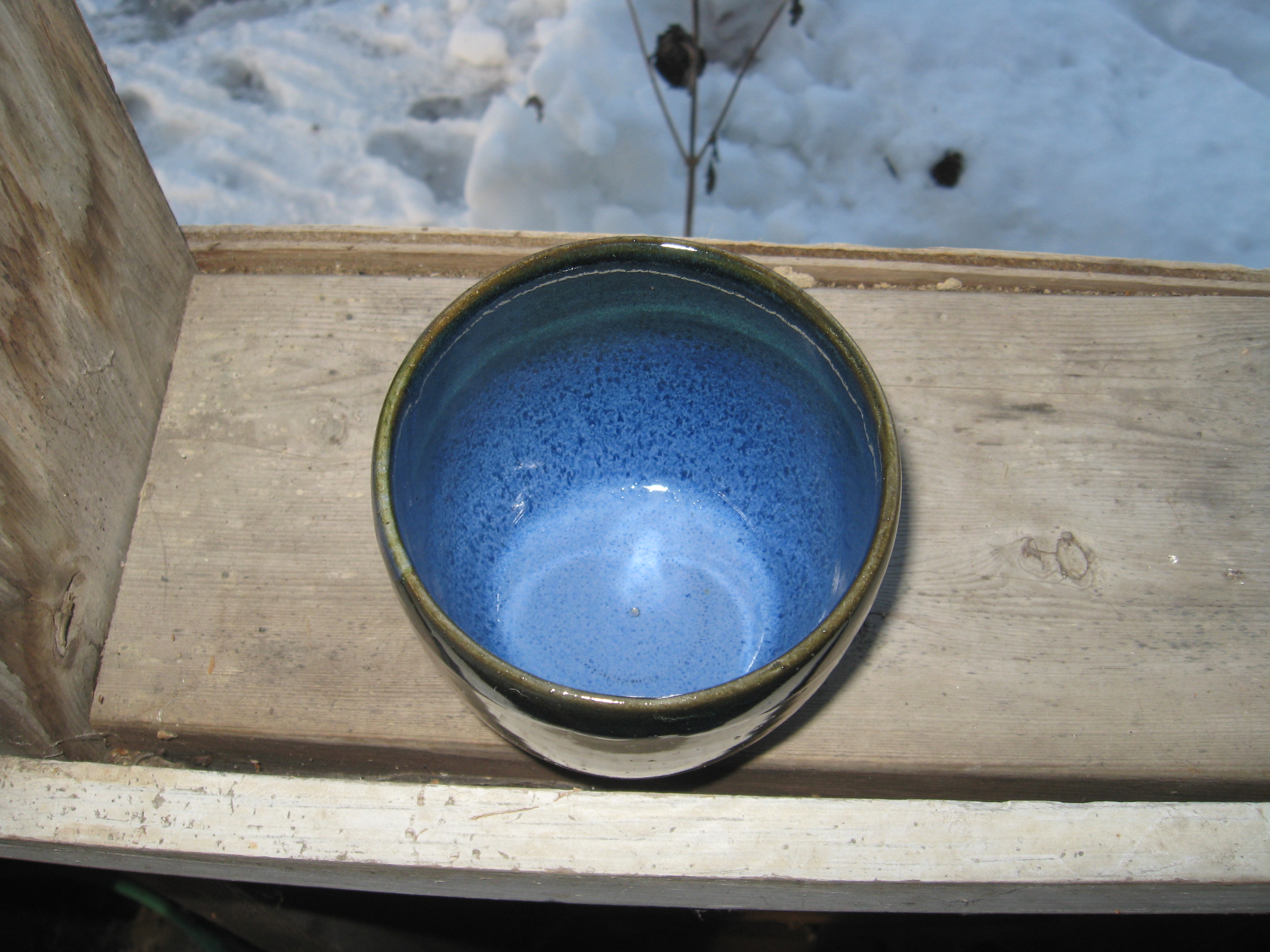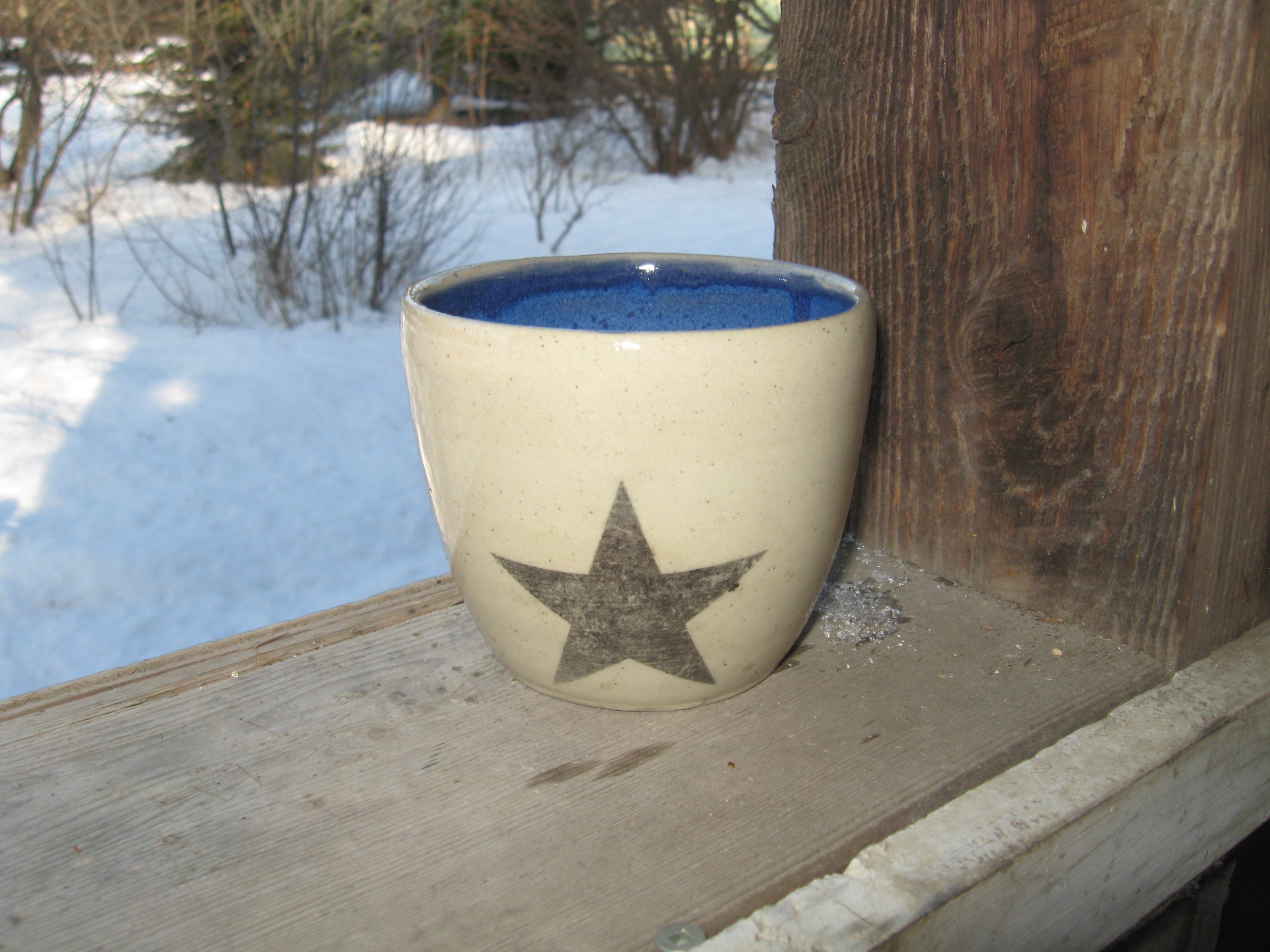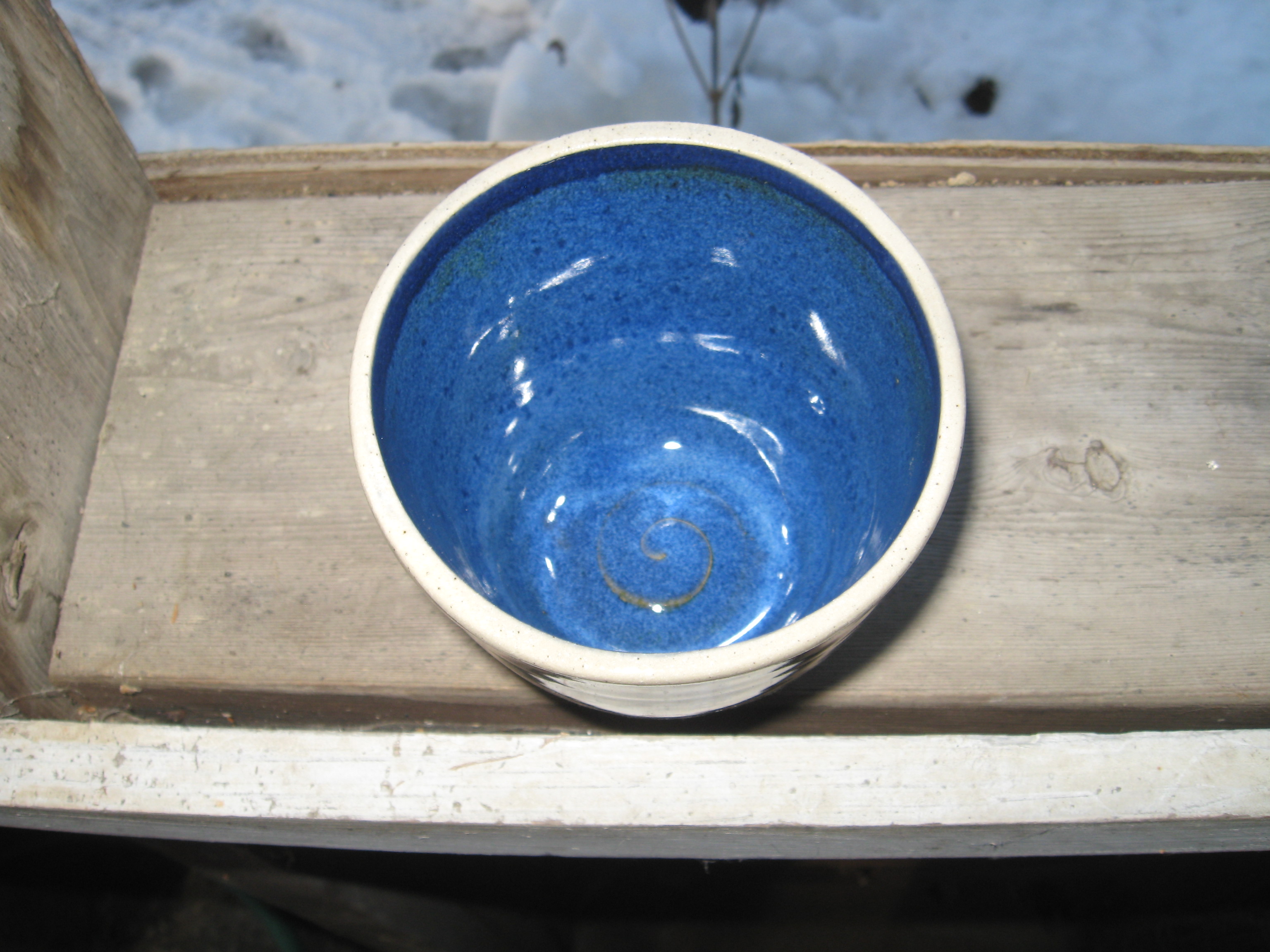 These marvelous mugs pulls the eye in a downward spiral. The first one is representative of my old style of dipping the rim of the mug in the coloured glaze.