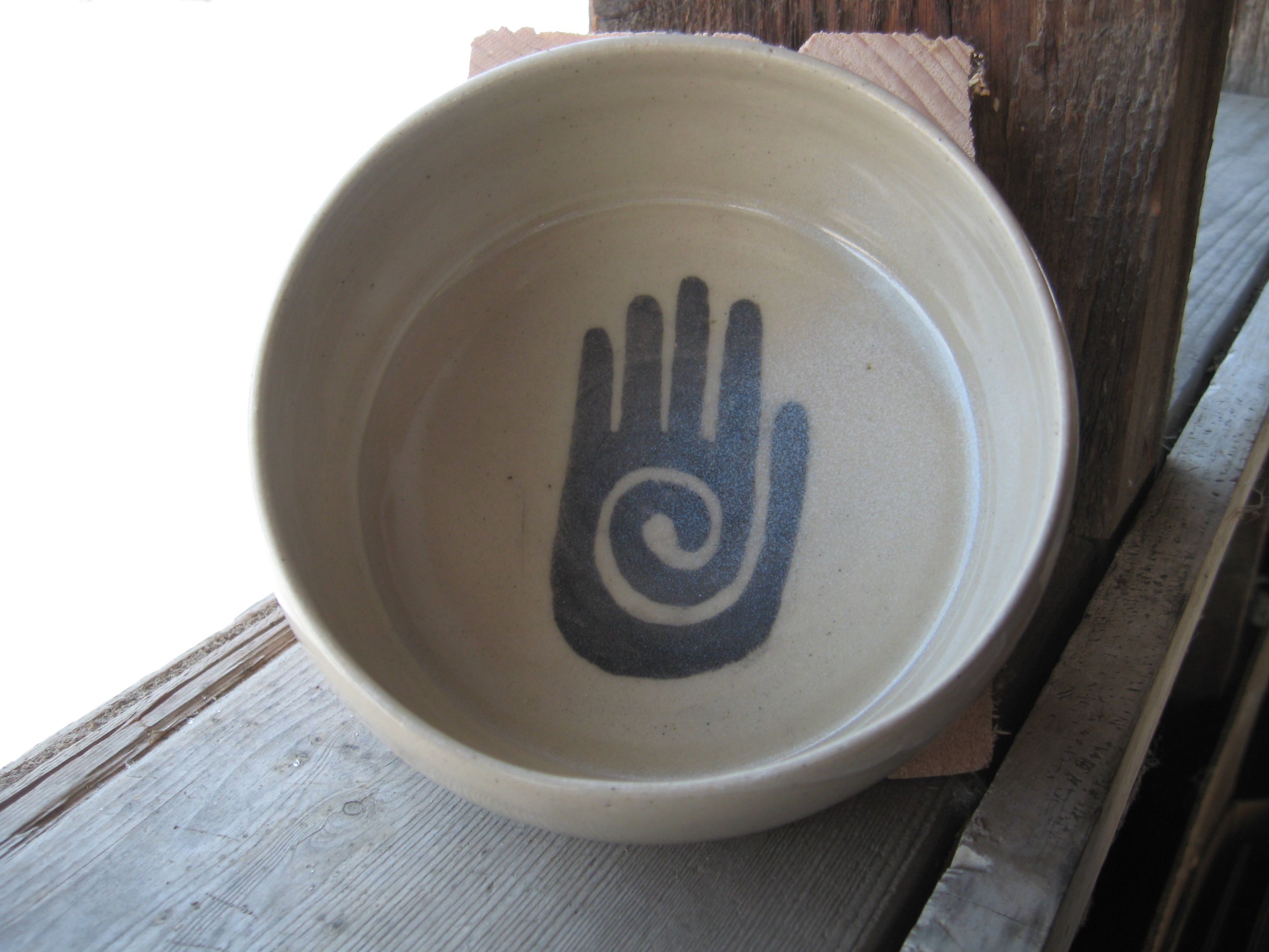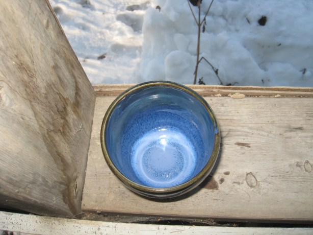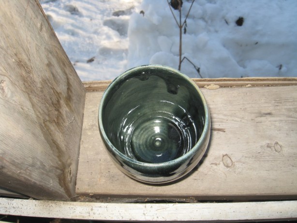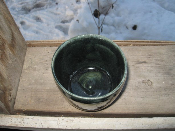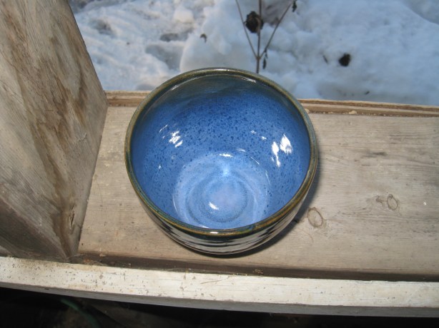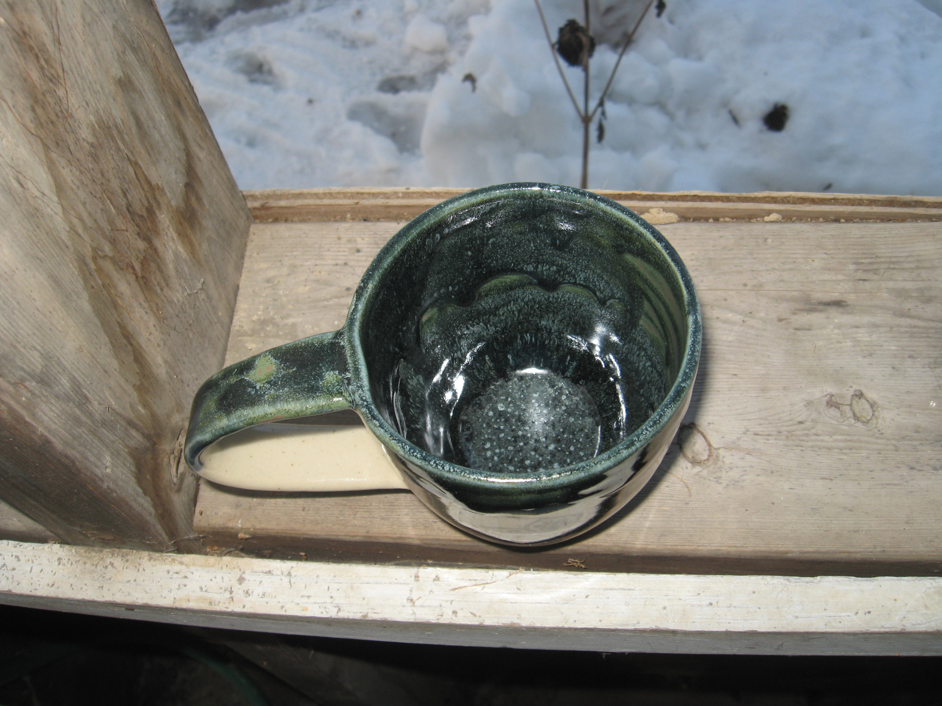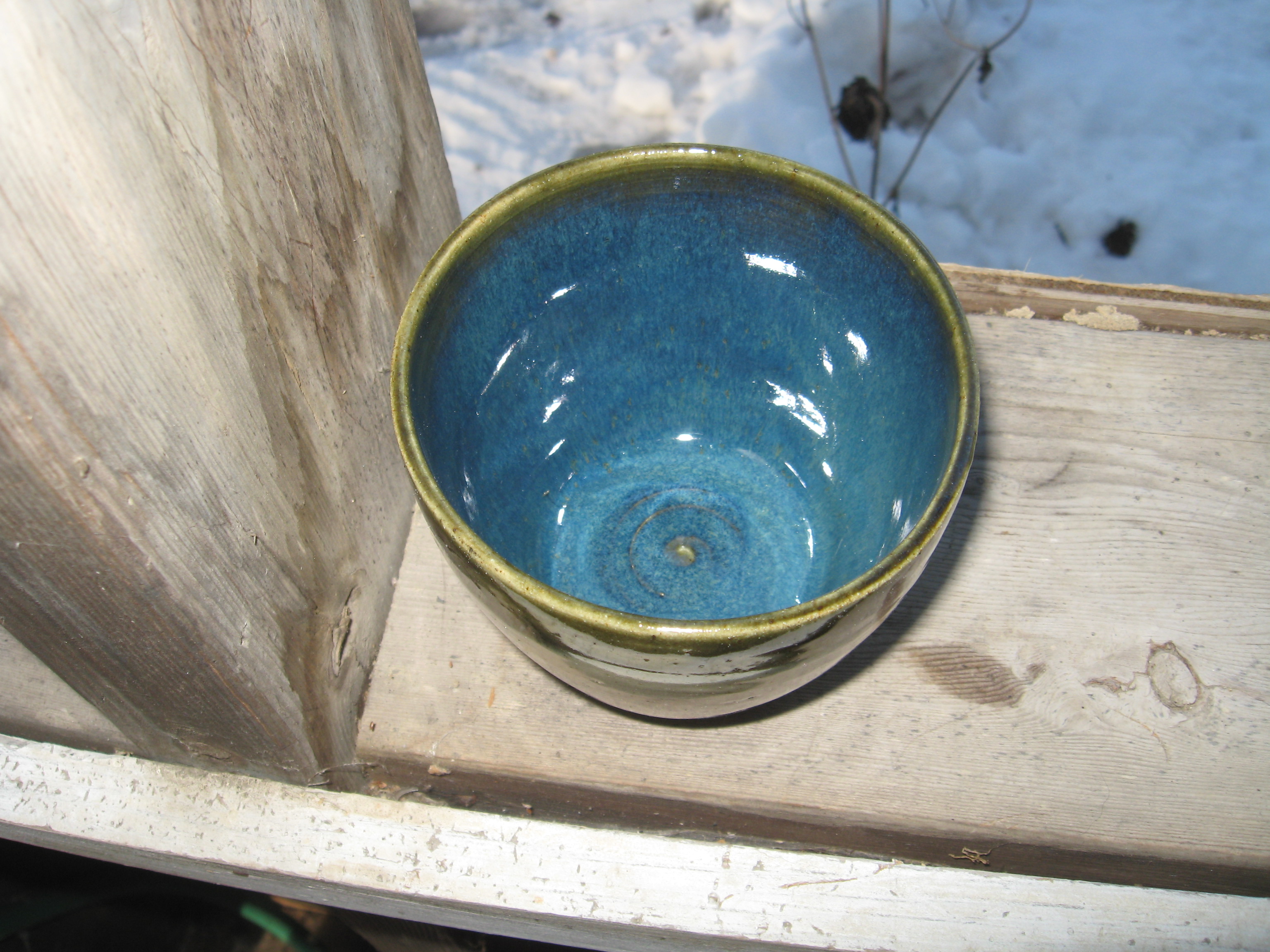 These marvelous mugs pulls the eye in a downward spiral. The first one is representative of my old style of dipping the rim of the mug in the coloured glaze.