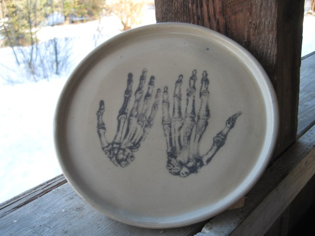 This large precious plate displays a frog skeleton ready to jump into your cupboard. It measures roughly 9″ in diameter.