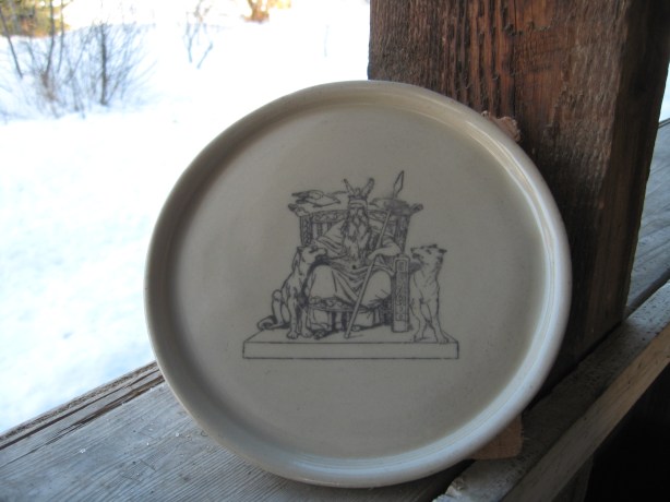Here is a precious medium plate with Odin on his throne.  He is holding Gungnir (his spear) and surrounded by animals because in Norse Mythology he is often attributed with shape shifting abilities into animal forms.